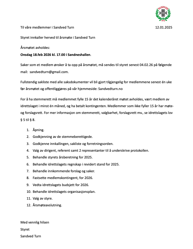 Innkalling til årsmøte i Sandved Turn